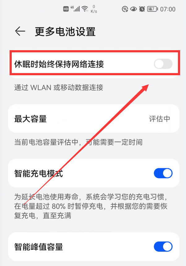 点击“更多电池设置”,这时,我们就可以看到“休眠时始终保持网络连接”的开关被关闭了(如下图)。