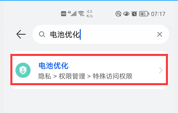 有的人为了提升手机续航能力,开启了电池优化功能,连最常用的微信也给一起优化了。我们打开手机的设置,点击设置界面顶部的搜索框,输入“电池优化”,下面就会显示“电池优化”的选项。