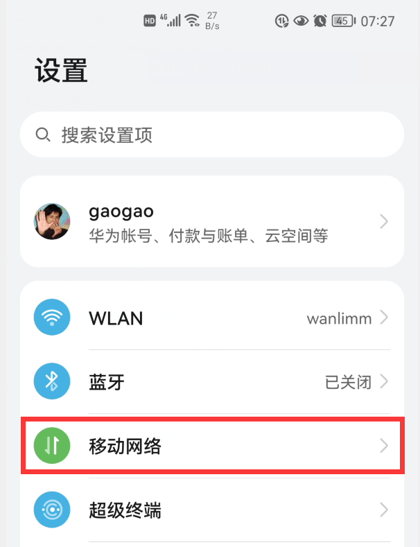 点击“移动网络”。