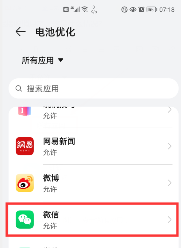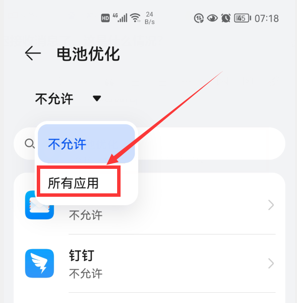 点击“不允许”,会弹出下拉菜单(如上图),点击“所有应用”,就会显示手机应用列表。