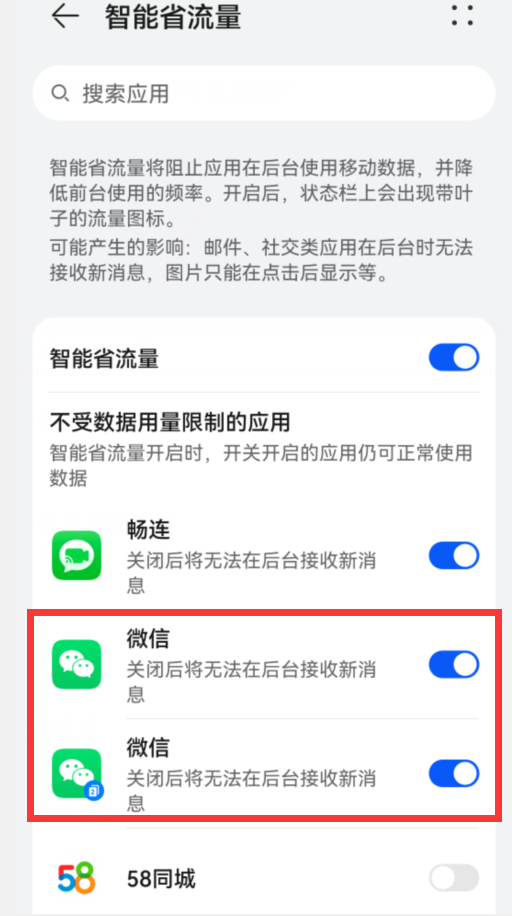 在上图的“智能省流量”的下面,有一个“不受数据用量限制的应用”,我们在它的下面找到微信,点击它右侧的开关,把它变成蓝色,这样,微信就不会受到“智能省流量”的影响。