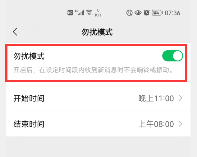 上图中的“勿扰模式”是开启的,我们可以修改它的开始时间和结束时间,来达到我们的目的,也可以直接点击“勿扰模式”右侧的开关,把它变成灰色,就关闭了“勿扰模式”。