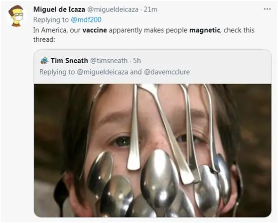 事实上,关于“疫苗会磁化人体”的阴谋论这跟去年口罩含有5G天线如出一辙,此前就有专家辟谣:新冠疫苗不含金属或微芯片,不会使接种者产生磁性。5G系统会破坏免疫系统也没有科学依据,纯属子虚乌有。